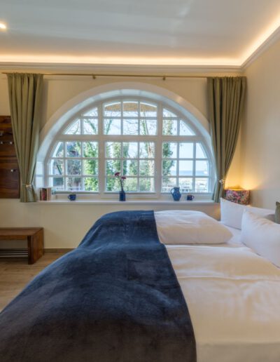 Das Gästehaus Bergfalke thront auf einem der höchsten Punkte im Ort, dem Schifferberg. Etwa dreißig Stufen führen hinauf zu dem denkmalgeschützten Domizil. Von hier aus gibt es zu jeder Jahreszeit etwas zu entdecken: Zeesboote und Eissegler auf dem Bodden, Kraniche und Wildgänse am Himmel. Manchmal traut sich auch ein Hase auf die Wiese.